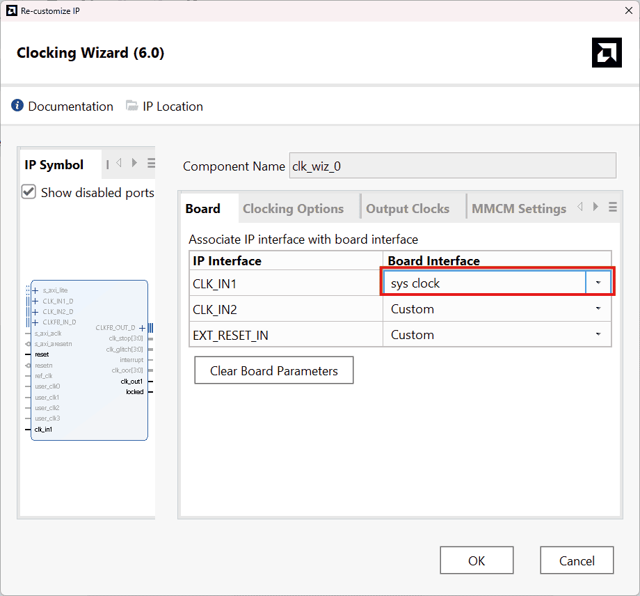 Double click on “Clocking Wizard” IP and select “CLK_IN1” as “sys clock“.