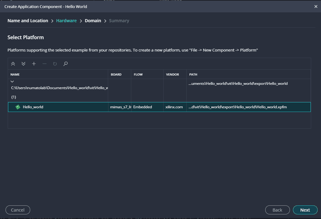 Create a new platform for the project, by selecting “Create Platform Component”, click “Next”, in the Flow tab select the XSA file saved using the step 15 and finally click “Next” and “Finish” respectively.