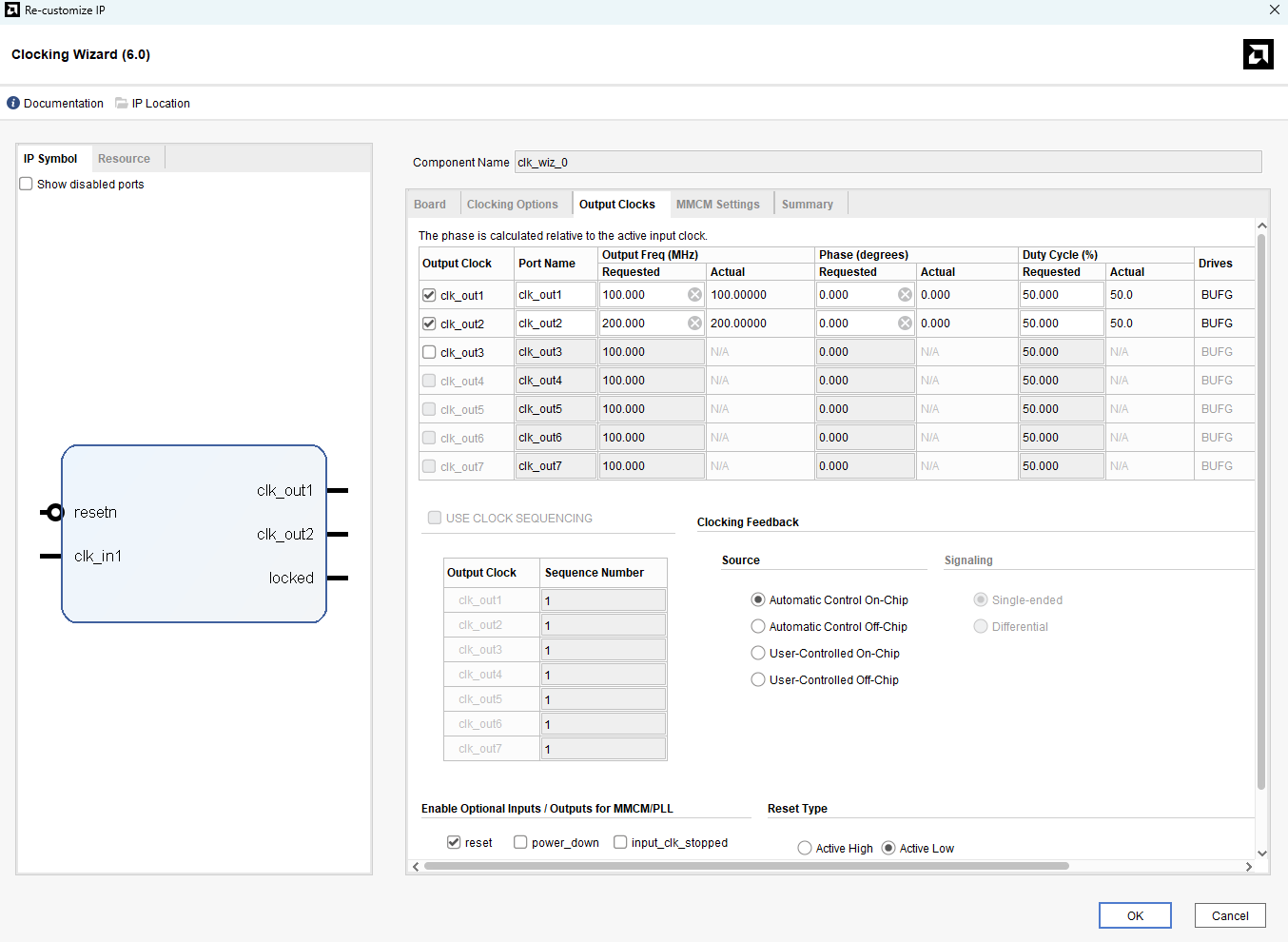 Double-click on the “Clocking Wizard” IP block and change the settings as shown below. In the “Output Clocks” section, set clk_out1 frequency to 100 MHz and clk_out2 frequency to 200 MHz. Set “Reset Type” Active Low and click “OK” to customize the IP.