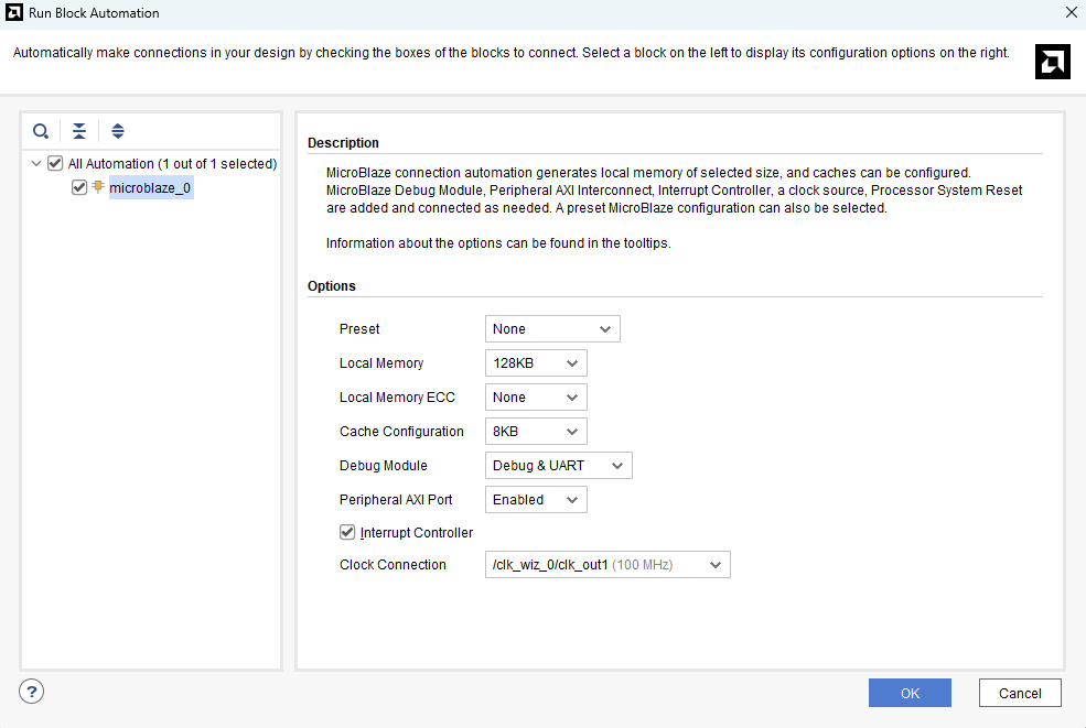Click “Run Block Automation” and change the settings as shown below. Enable “Debug & UART” in the Debug Module to use JTAG UART of the MicroBlaze Debug Module (MDM). We will use JTAG UART since Aller does not have an onboard USB interface. Also, enable the “Interrupt Controller” checkbox.