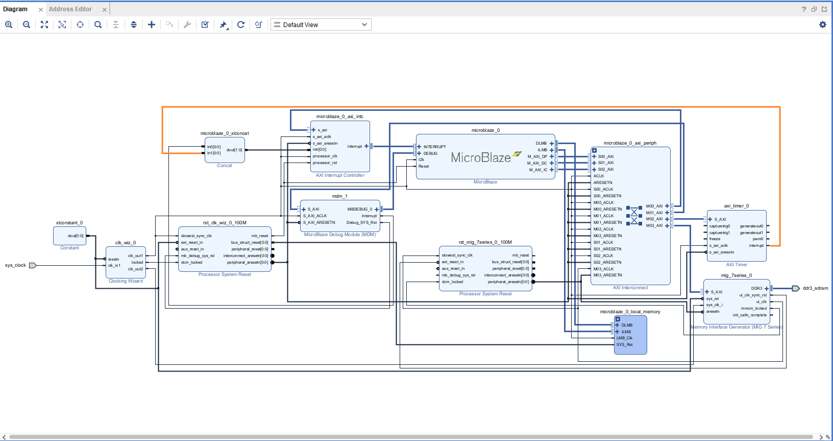 Connect the interrupts from mdm_1 and axi_timer_0 to the Concat block as shown below (the order does not matter). Make sure that the final design looks similar to the image below.