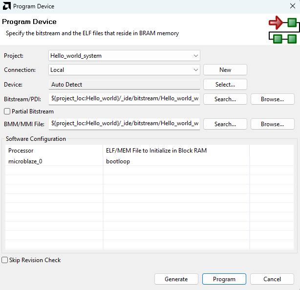 Program the FPGA on Aller with the generated bitstream and simple bootloop firmware by selecting the “Program Device” option from the “Vitis” menu.