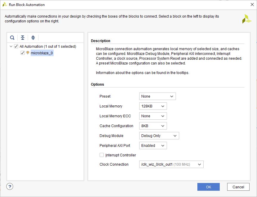 Click “Run Block Automation” and change the settings as shown below. Click “OK” for Vivado to automatically configure the blocks for you.