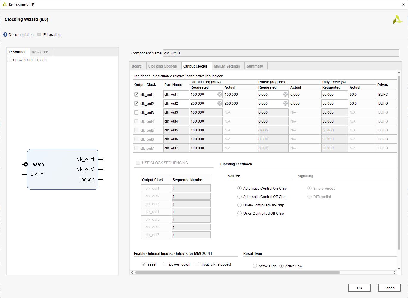 Double-click on the “Clocking Wizard” IP block and change the settings as shown below. In the “Output Clocks” section, set clk_out1 frequency to 100 MHz and clk_out2 to 200 MHz. Set “Reset Type” as Active Low and click “OK” to customize the IP.