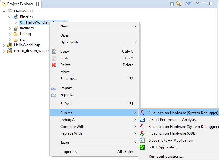 Connect USB Micro-B cable to the Nereid board and open the COM port corresponding to Nereid in any serial terminal (PuTTY, Tera Term, etc.) with 9600 baud-rate. Now, right-click on the .elf file in the Project Explorer and select “Launch on Hardware” as shown below.