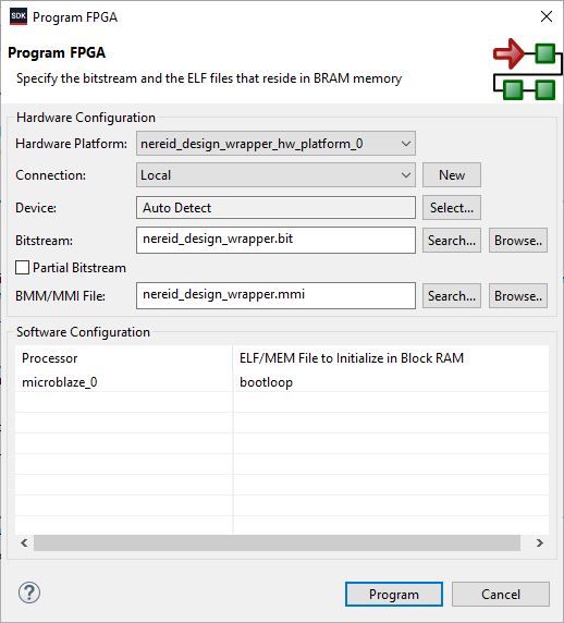 Program the FPGA on Nereid with the generated bitstream and simple bootloop firmware by selecting the “Program FPGA” option from the “Xilinx” menu in SDK Window.
