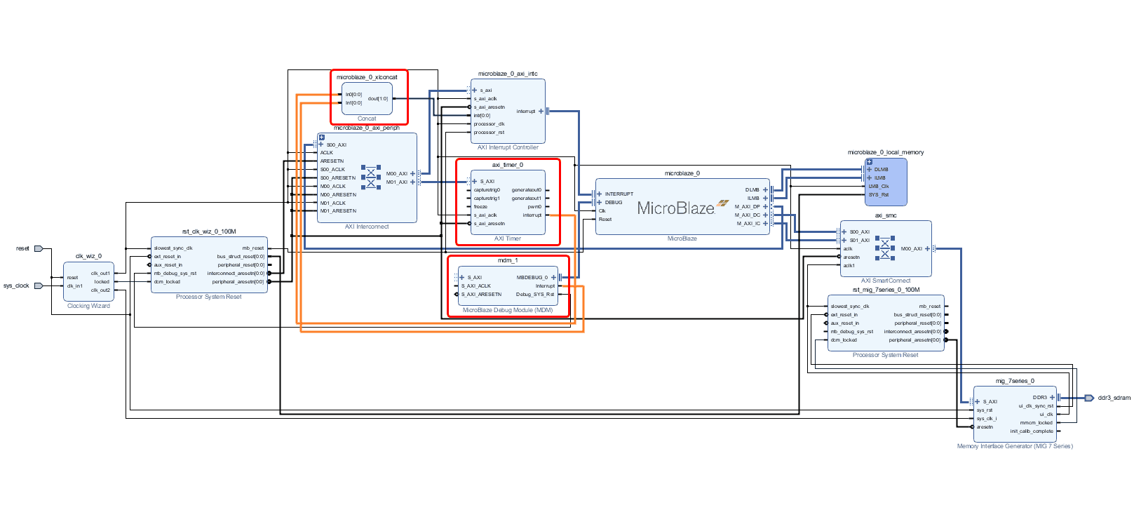 Connect interrupt output lines from “AXI Timer” and “MicroBlaze Debug Module” to the Concat block as shown in the picture below. The blocks in question are highlighted in red.