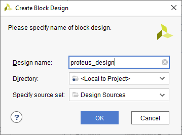 In the “Flow Navigator” panel, click “Create Block Design” under the IP integrator section. Give an appropriate name to the design and click “OK” (the author used “proteus_design” as the design name).