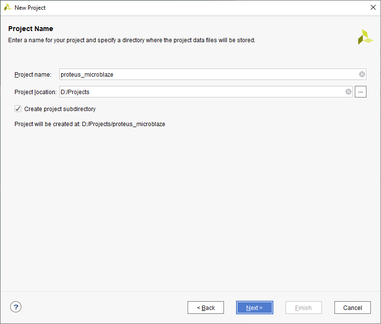 Open the Xilinx Vivado Design suite, go to “File -> Project -> New” to create a new project. The “New project” window will pop up. Click “Next” to continue
