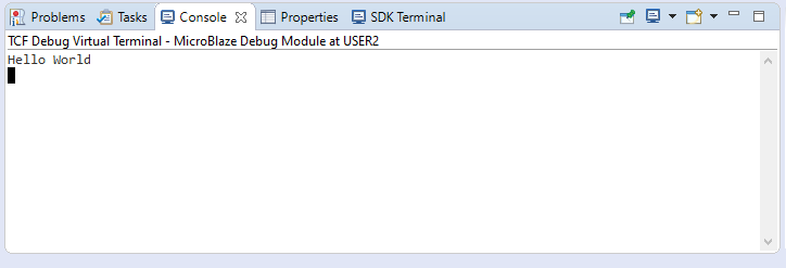 If everything went well, the HelloWorld application running on the board should print “Hello World” over the JTAG-UART which should be displayed in the SDK’s Console terminal as shown in the image below.