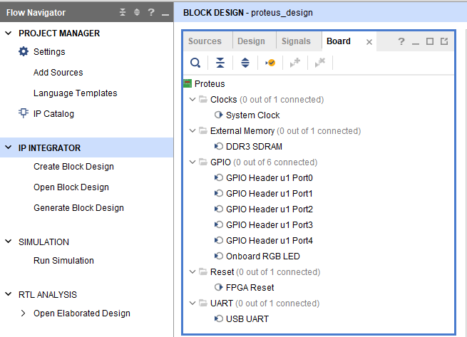 We need to create a design using Microblaze IP along with other peripherals. The default peripherals available for the Proteus Board will be displayed in the “Board” section of the window as shown below in the screenshot.