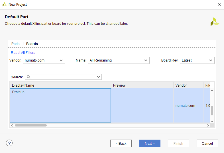 At the “Default Part” window, select the “Boards” tab and select the vendor as “numato.com”. Select the board name “Proteus” and click “Next” to continue. If Proteus is not displayed in the “Boards” list, you will have to install the Proteus board support files correctly and retry this step. You can download the Proteus board support files for Vivado from here. Follow the “readme” in the link on how to install the Vivado board files in your system.