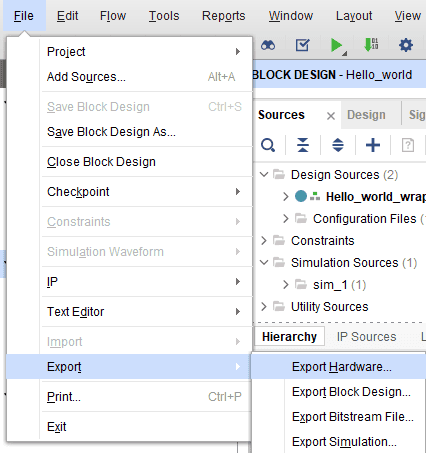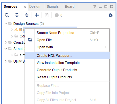 Right-click “Hello_world” in the “Sources” window, and select “Create HDL Wrapper” from the popup menu. Click “OK” on the window that appears to finish generating a wrapper
