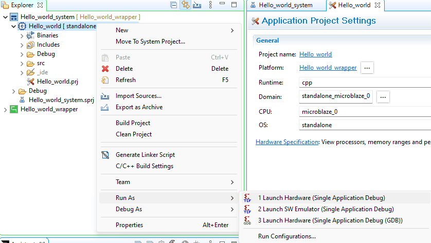 Right-click on the .elf file in the Project Explorer and select “Launch on Hardware” as shown below.