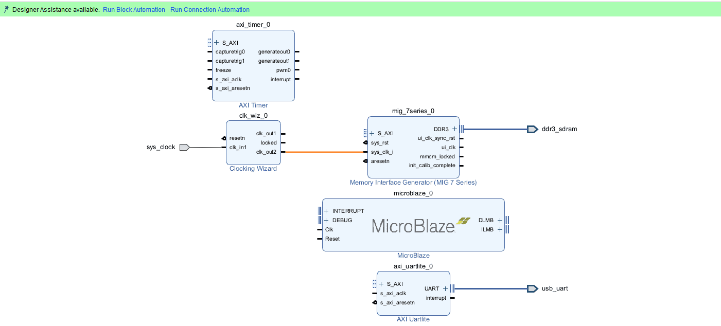 Add System Clock, DDR3 SDRAM and USB UART to the design by double-clicking the corresponding peripherals. In the Diagram window, right-click and select “Add IP” from the popup menu. Search for “MicroBlaze” & “AXI Timer” and add them to the design by double-clicking them.