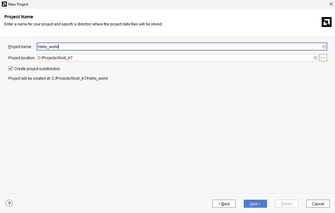 In the “Project Name” window, enter a name for the project and save it at a suitable location. Select the option “Create project subdirectory” to keep all the project files in a single folder. For this example, “Hello_world” is used as the project name, but feel free to use any name. Click “Next”.