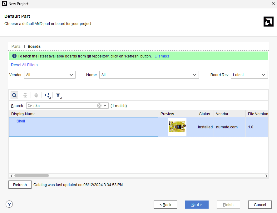In the “Default Part” window, select the “Boards” tab. Choose the Vendor as “numato.com”, filter the Name “Nereid” and select the board as shown below. Click “Next” to continue. If Nereid is not displayed in the boards list, make sure that the board support files are installed correctly.