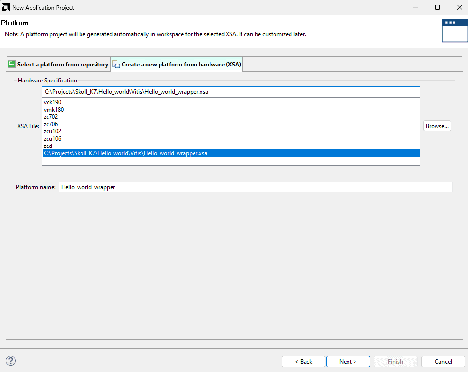 In the Platform window, select Create a new platform from hardware tab and import the XSA file which is already created (Provide XSA file location). Click Next.