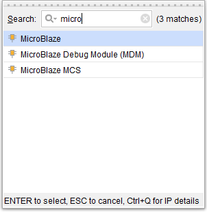 In the Diagram window, right-click and select “Add IP” from the popup menu. Search for “MicroBlaze” and add it to the design by double-clicking.
