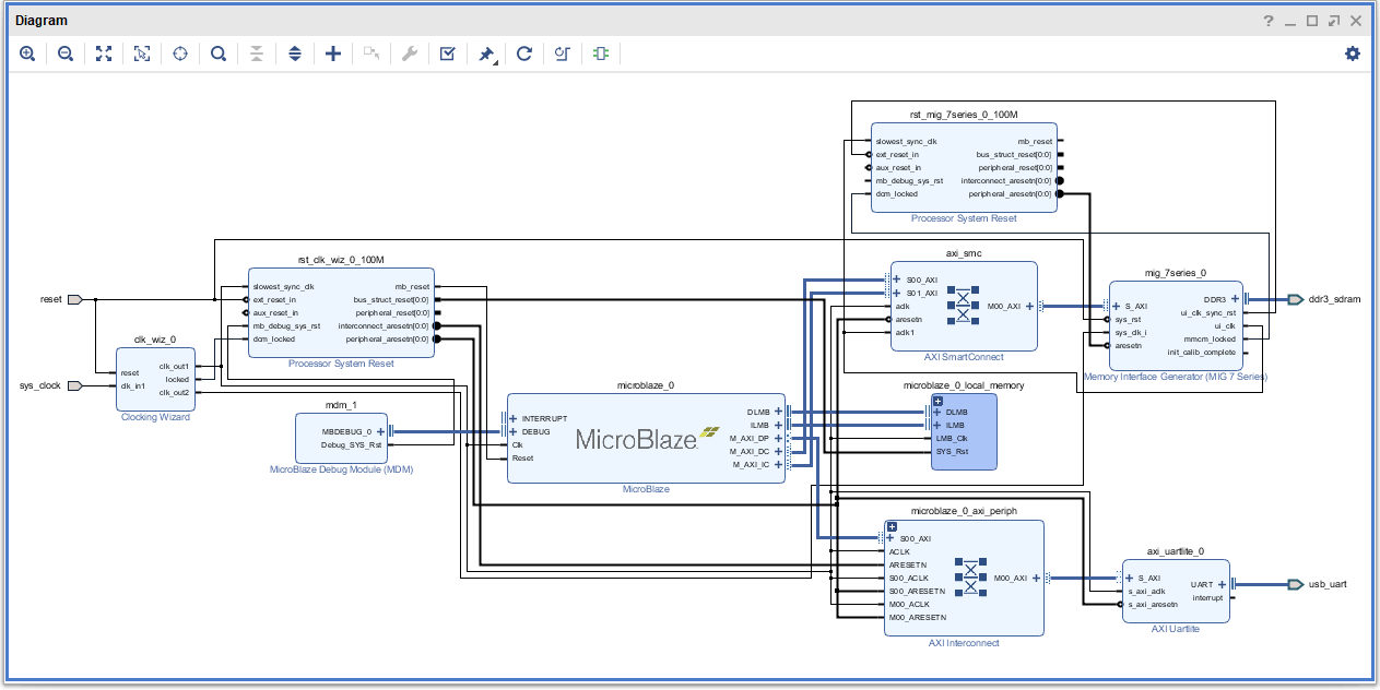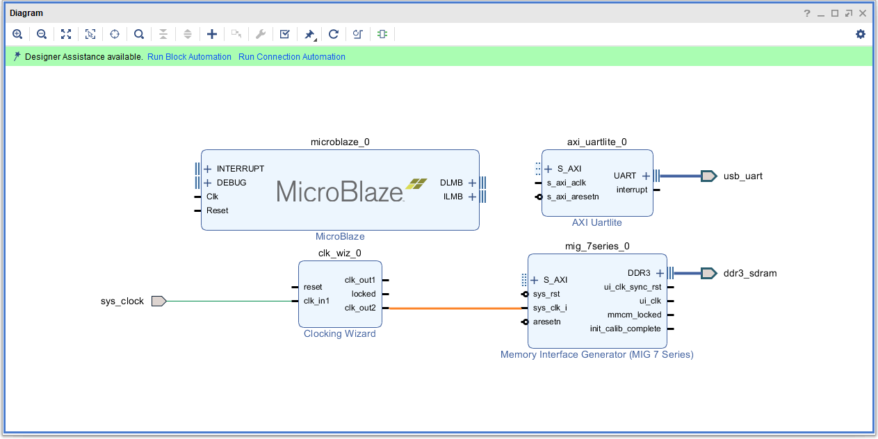 Once the Block Automation is complete, select “Run Connection Automation” so Vivado can connect the blocks together to make a complete system. Select the “Validate Design” option from the Tools menu to make sure that the connections are correct and save the design. The final design will look similar to the image below.