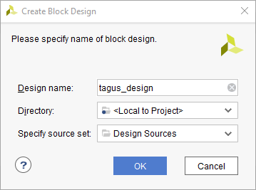 In the “Flow Navigator” panel, select “Create Block Design” under the IP integrator section. Give an appropriate name (Eg: “tagus_design”) to the design and click “OK”.