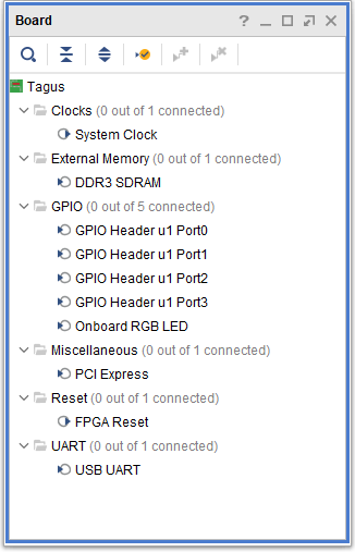 In the “Board” tab, we can observe the default peripherals available for the Tagus board. Drag and drop System Clock, DDR3 SDRAM and USB UART peripherals into the design.
