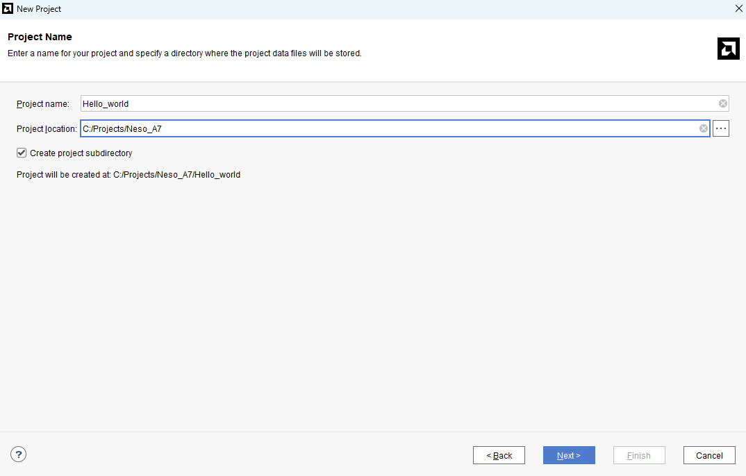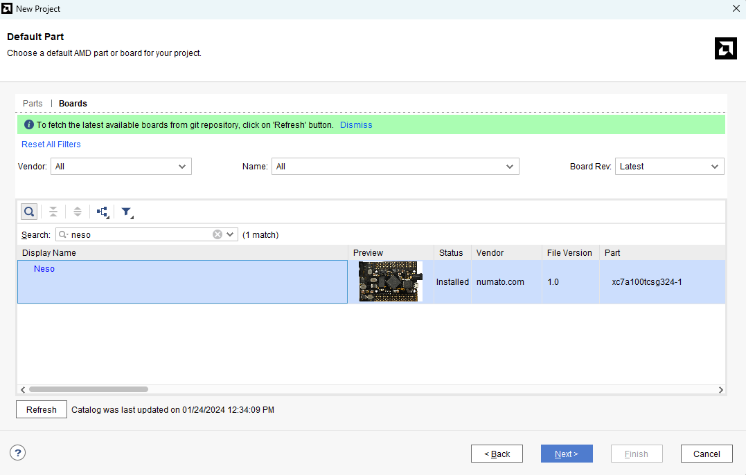At the “Default Part” step, select “Boards” and then select Numato Lab Neso Artix 7 FPGA Module and then click next. If Neso is not displayed in the boards list, you will need to install Neso board support files appropriately and retry this step. You can download Neso support files for Vivado from here. Follow the readme in the link on how to install the Vivado board files in your system.