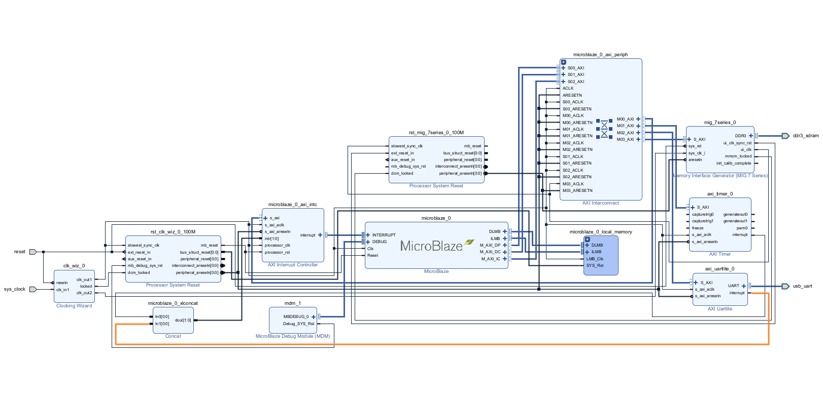 AXI stands for Advanced eXtensible Interface. AXI is a bus interconnect based on ARM’s popular AMBA bus architecture. In a Microblaze system AXI connects the microprocessor to all peripherals in the system. The only exception is Block RAM which is attached to the processor through LMB (Local Memory Bus). AXI Lite is available for connecting low throughput peripherals to the system such as UART, GPIO etc.… AXI Lite uses less logic resources on FPGA compared to AXI. Usually AXI is used to connect high throughput peripherals such as DDR memory, Ethernet etc… Again, a detailed understanding of AXI is not required for following this article. But for the curious readers, AXI Reference Guide is available here.