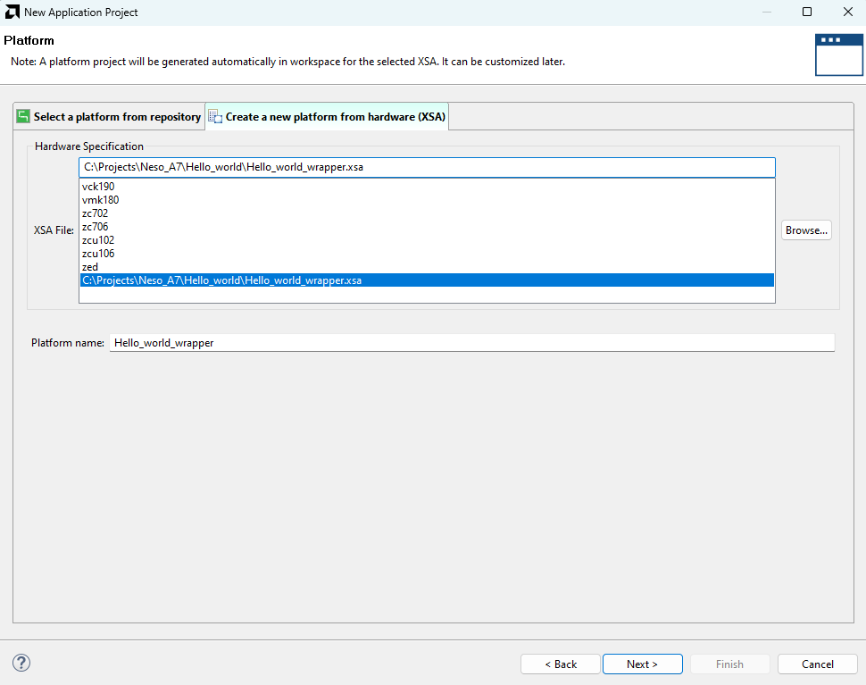 In the Platform window, select Create a new platform from hardware tab and import the XSA file which is already created (Provide XSA file location). Click Next
