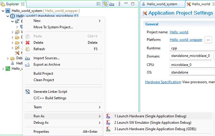 Open the COM port corresponding to Neso A7 in any serial terminal (PuTTY, Tera Term, etc.) with a 9600 baud rate (the default baud rate given in UART IP). Now, right-click on the .elf file in Project Explorer and select “Launch Hardware” as shown below.