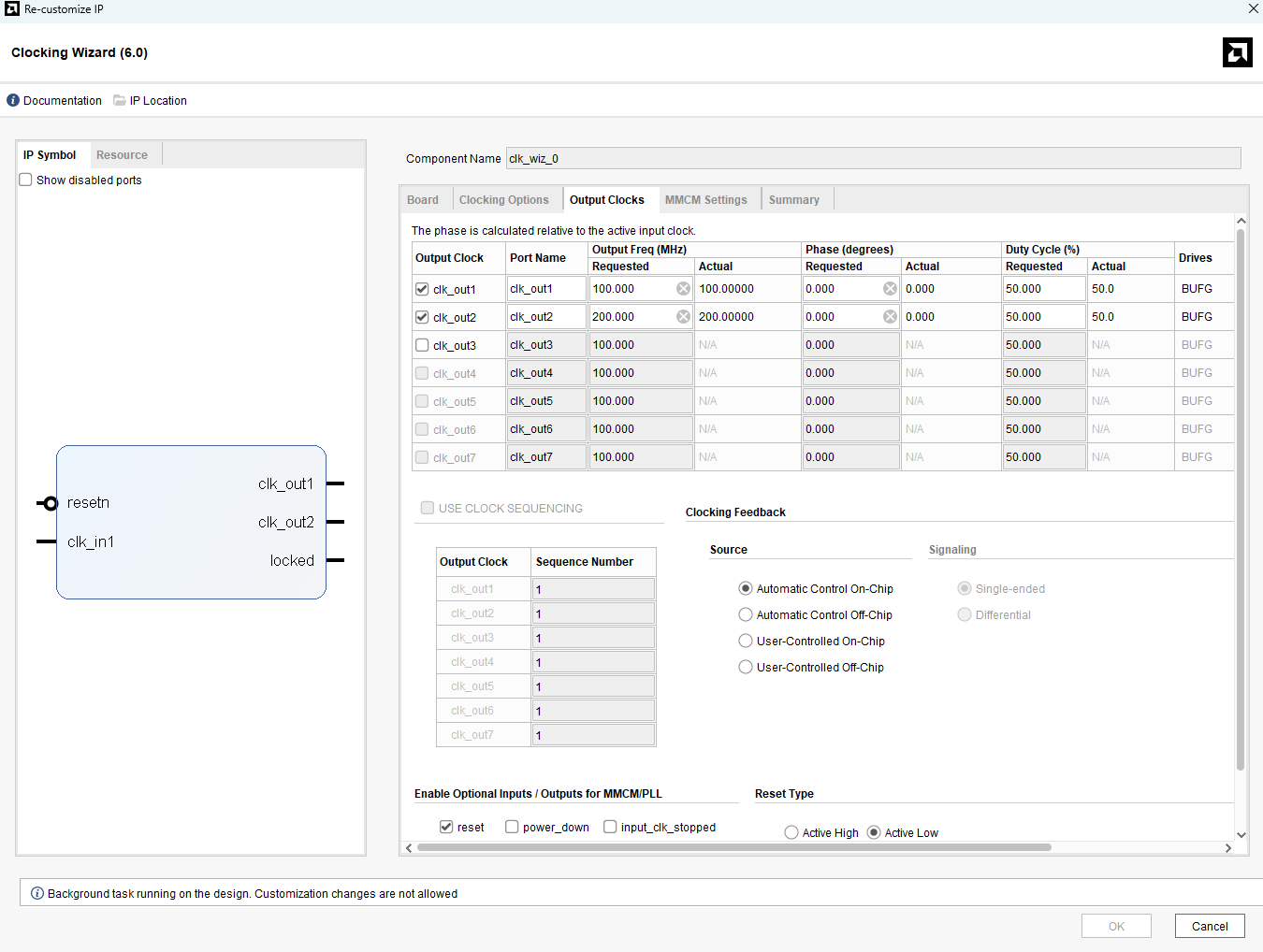 Double click “Clocking Wizard” IP and customize “Output Clocks” settings as shown in the following image.