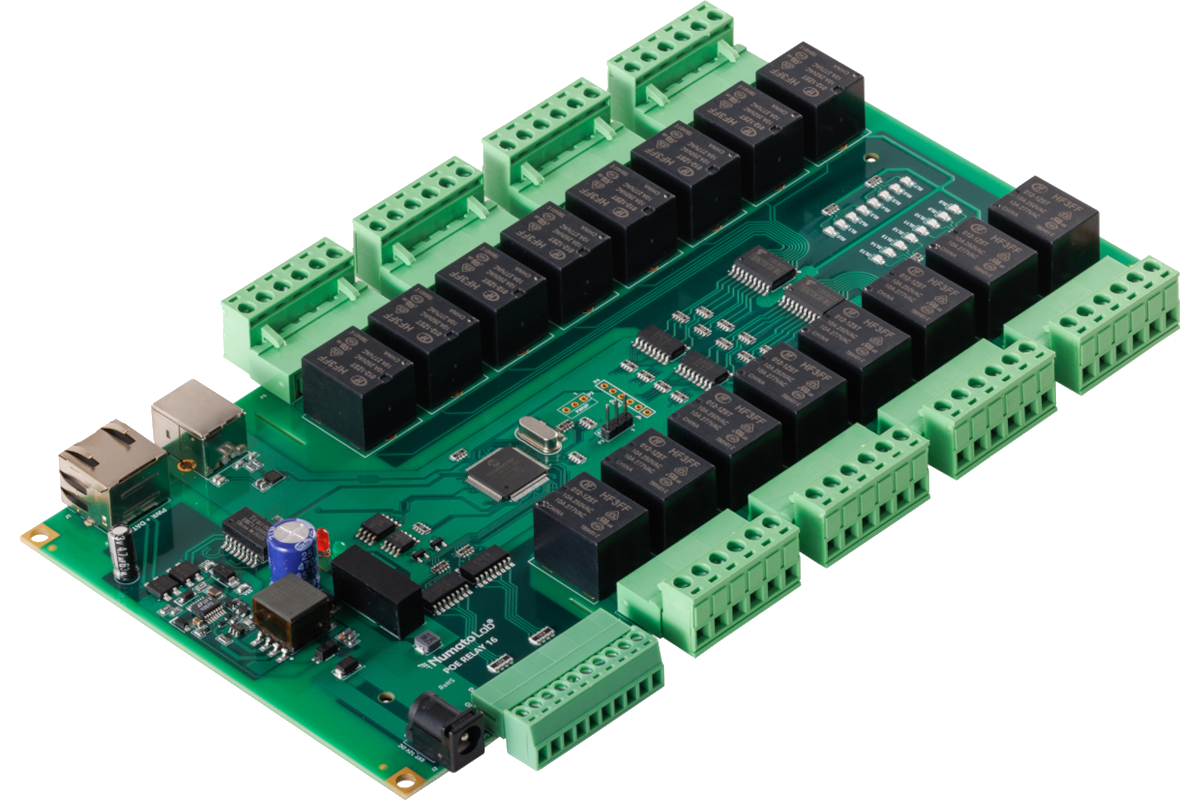 - 16 onboard 12V SPDT Relays with individual LEDs for status