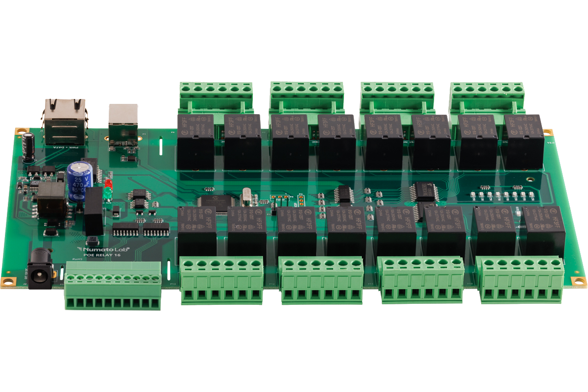 Numato Lab 16 Channel PoE (Power over Ethernet) Relay module allows controlling electrical devices remotely through Ethernet. This is very helpful in those situations where the device that needs to be controlled is located far from the PC and thus can not run through USB cable. Numato Lab PoE Relay modules are designed to be very easy to set up and use. And as in the name, this module doesn’t need a wire for power and data separately, one Ethernet cable serves both the purpose!