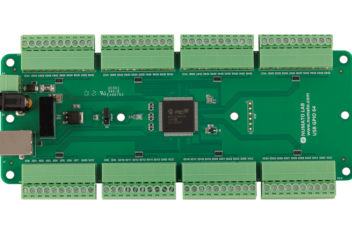 Numato Lab’s 64 Channel USB GPIO Module helps to connect real-world devices to your computer easily through USB. No USB specific knowledge is required to set up and use this module. Numato Lab’s GPIO devices provide an interface that looks like a Serial Port on your Operating System and thus effectively hiding the complexity of USB. All that you need to operate GPIOs is a standard Serial Terminal Emulator such as HyperTerminal/Teraterm or your favorite programming language such a C/C++, Python, Perl, etc… Besides providing standard General Purpose IOs, this product has multiple Analog Inputs as well. These Analog inputs can be used to read Analog quantities such as temperature, pressure, etc.. with the help of appropriate sensors.