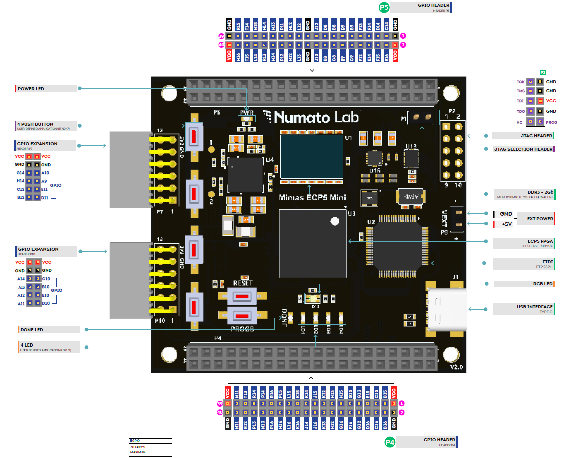 - FPGA – 70 IOs (35 professionally length matched Differential Pairs) and two 2×6 Expansion Headers