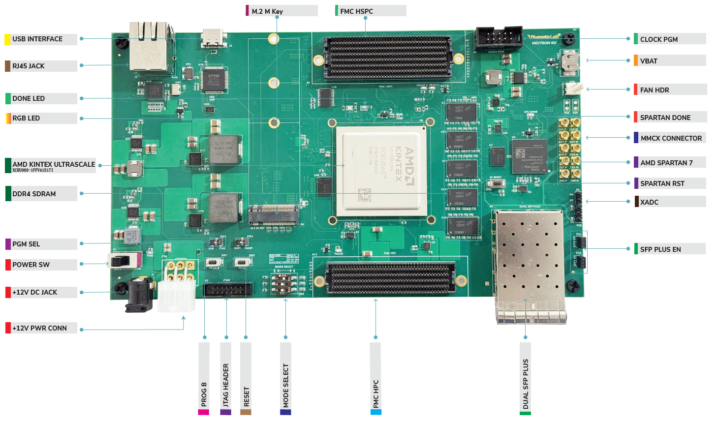 The Neutron KU60 FPGA Development Board is a high-performance platform built around the AMD Kintex UltraScale XCKU060 FPGA, designed for demanding high-speed computing, networking, and signal-processing applications. Featuring 4GB ECC-enabled DDR4, dual QSPI configuration memory, multiple clock sources, high-speed SFP+ connectivity, GTH transceiver access, and versatile expansion through FMC+ HSPC, FMC HPC, and an M.2 slot, the board delivers exceptional flexibility for advanced development. With SelectMAP, JTAG/USB programming, and programmable clock options, Neutron KU60 provides a robust and adaptable environment for prototyping and deployment.