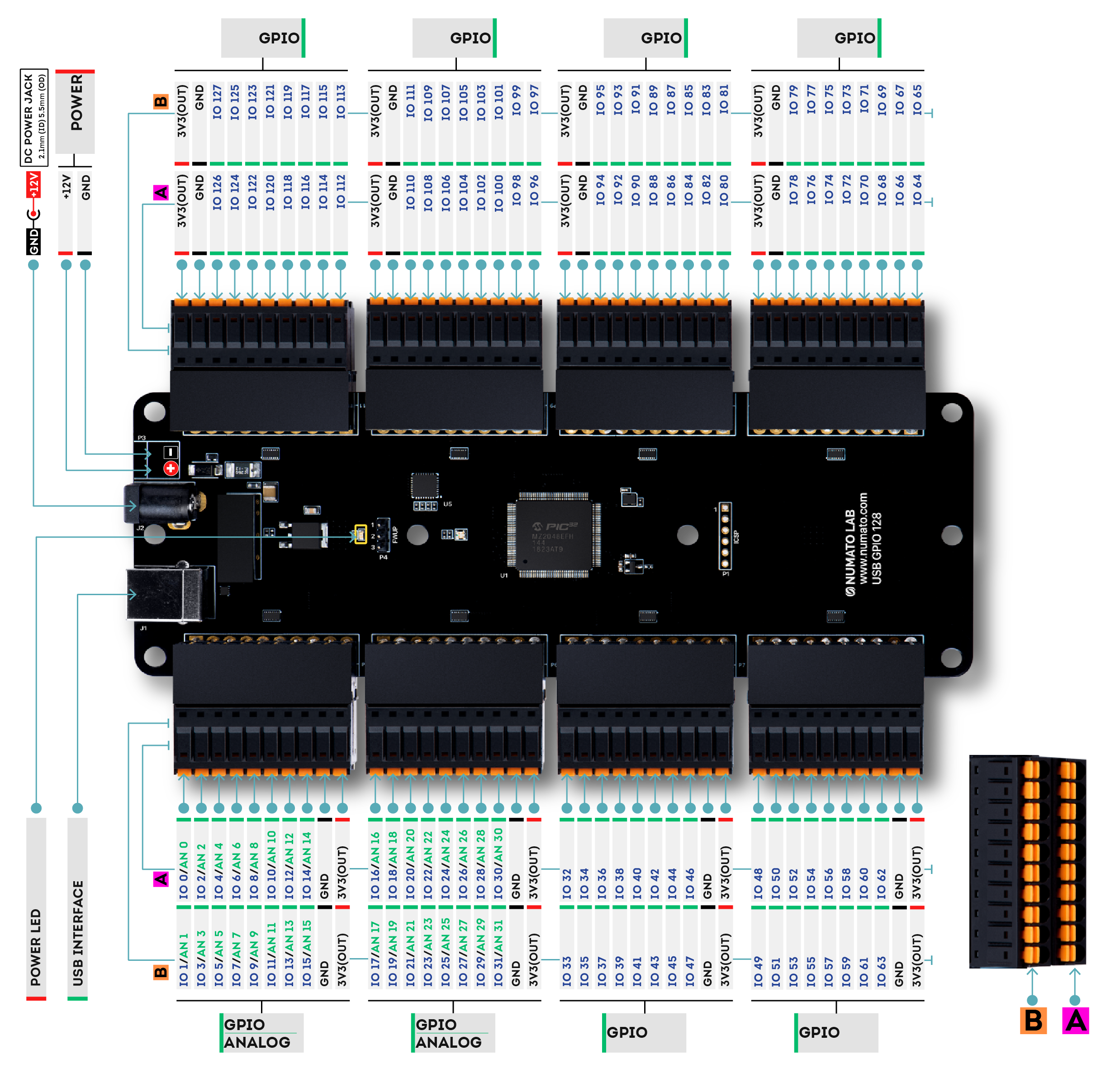 Numato Lab's 128 Channel USB GPIO Module helps to connect real-world devices to your computer easily through USB. No USB specific knowledge is required to set up and use this module. Numato Lab's GPIO devices provide an interface that looks like a Serial Port on your Operating System and thus effectively hiding the complexity of USB. All that you need to operate GPIOs is a standard Serial Terminal Emulator such as HyperTerminal/Teraterm or your favorite programming language such a C/C++, Python, Perl, etc... Besides providing standard General Purpose IOs, this product has multiple Analog Inputs as well. These Analog inputs can be used to read Analog quantities such as temperature, pressure, etc.. with the help of appropriate sensors.
