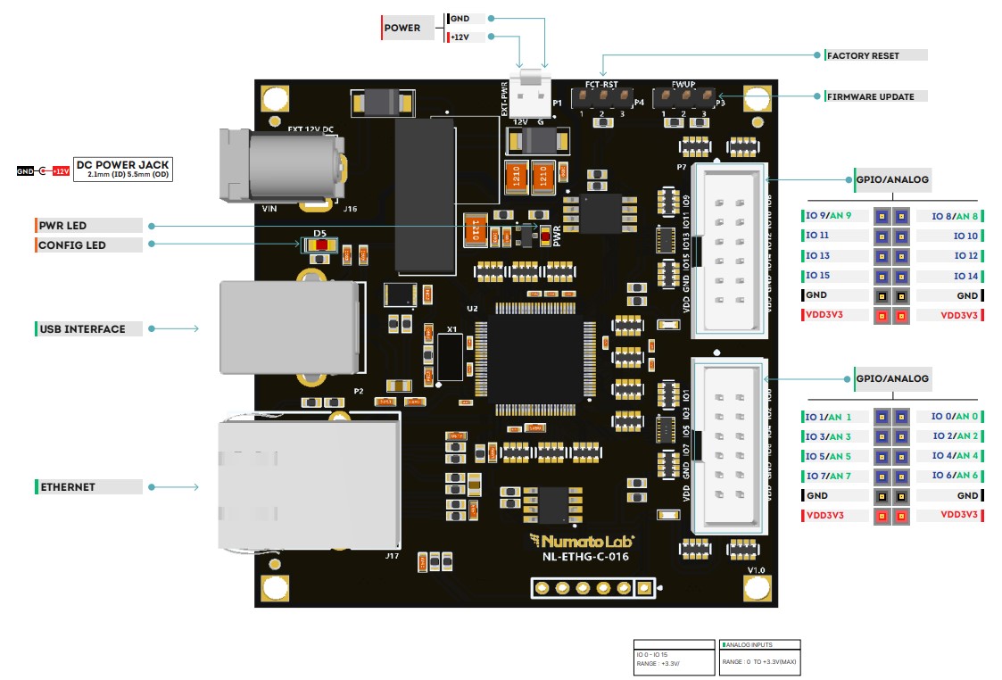 Numato Lab’s 16 Channel Ethernet Pluggable GPIO Module (NL-ETHG-C-016) is a low cost easily deployable solution for connecting your PC to other electronic circuitry through a network. This GPIO module can be accessed through a simple web interface, Telnet, or HTTP commands. Ease of use and wider operating system compatibility are the primary goals behind this product’s design. This simplicity allows the use of off-the-shelf Terminal Emulation programs such as PuTTY, TeraTerm for controlling the module with a simple set of human-readable commands through TELNET, HTTP, or through an easy-to-use Web interface. For power users, this module can be controlled by writing programs in various programming languages.
