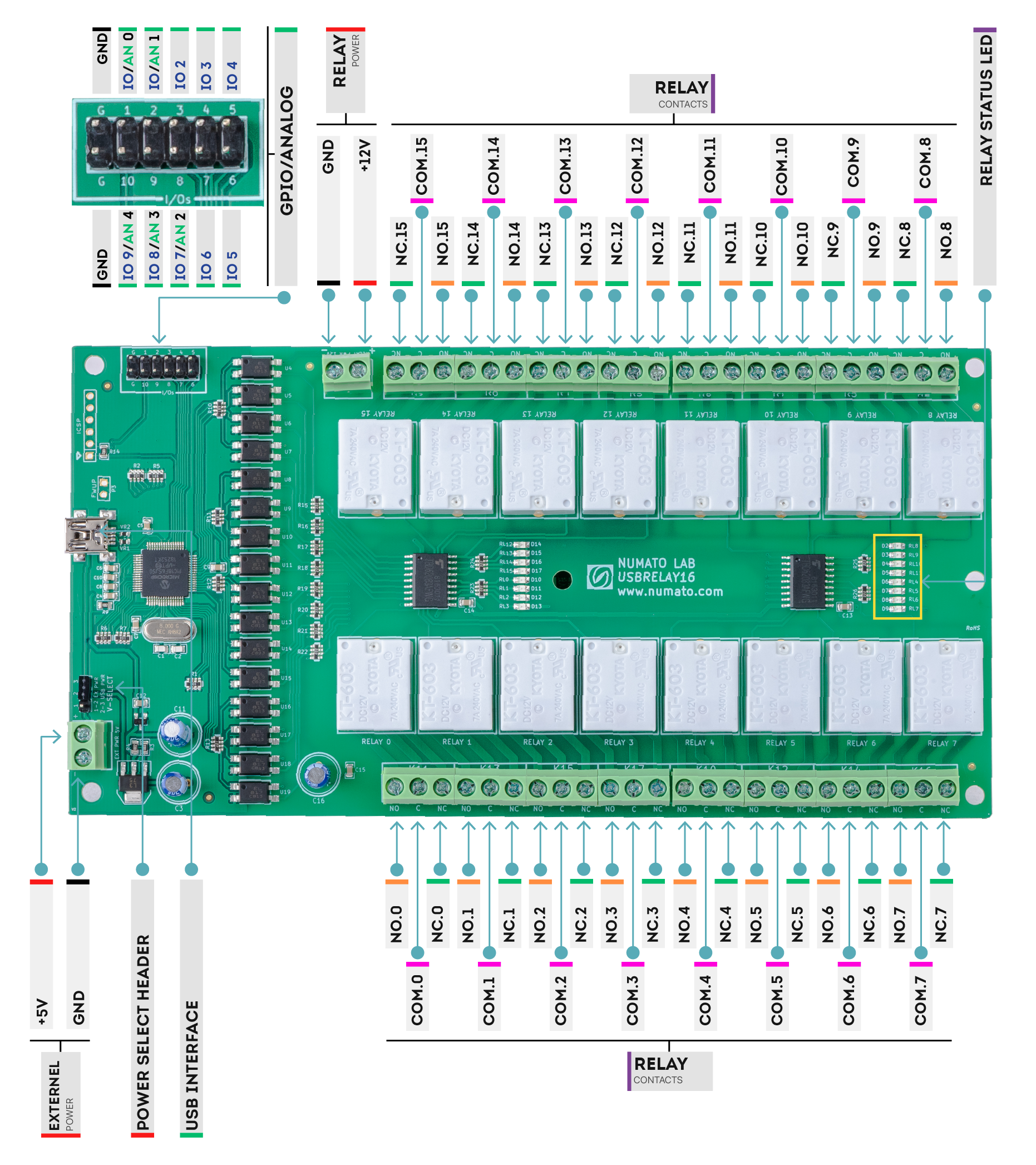 Numato's 16 Channel USB Relay Module is great for controlling your devices through USB without any USB protocol knowledge. This module plugs into your design seamless. Individual relay can be controlled by simple commands. Numato's URMC16 16 Channel USB Relay Module provides exceptional value for money. It has sixteen onboard 12V/ 24V DC relays that can switch up to 7A load. The relays and GPIOs can be controlled and read status by simple commands. The board, when attached to a PC/Laptop shows up as a serial port and all you need to control the board is a serial terminal application like HyperTerminal or Putty. This board can easily be controlled by writing a simple serial port application in VC++, VB, VBA (Word, Excel, etc), Perl, Python, etc.