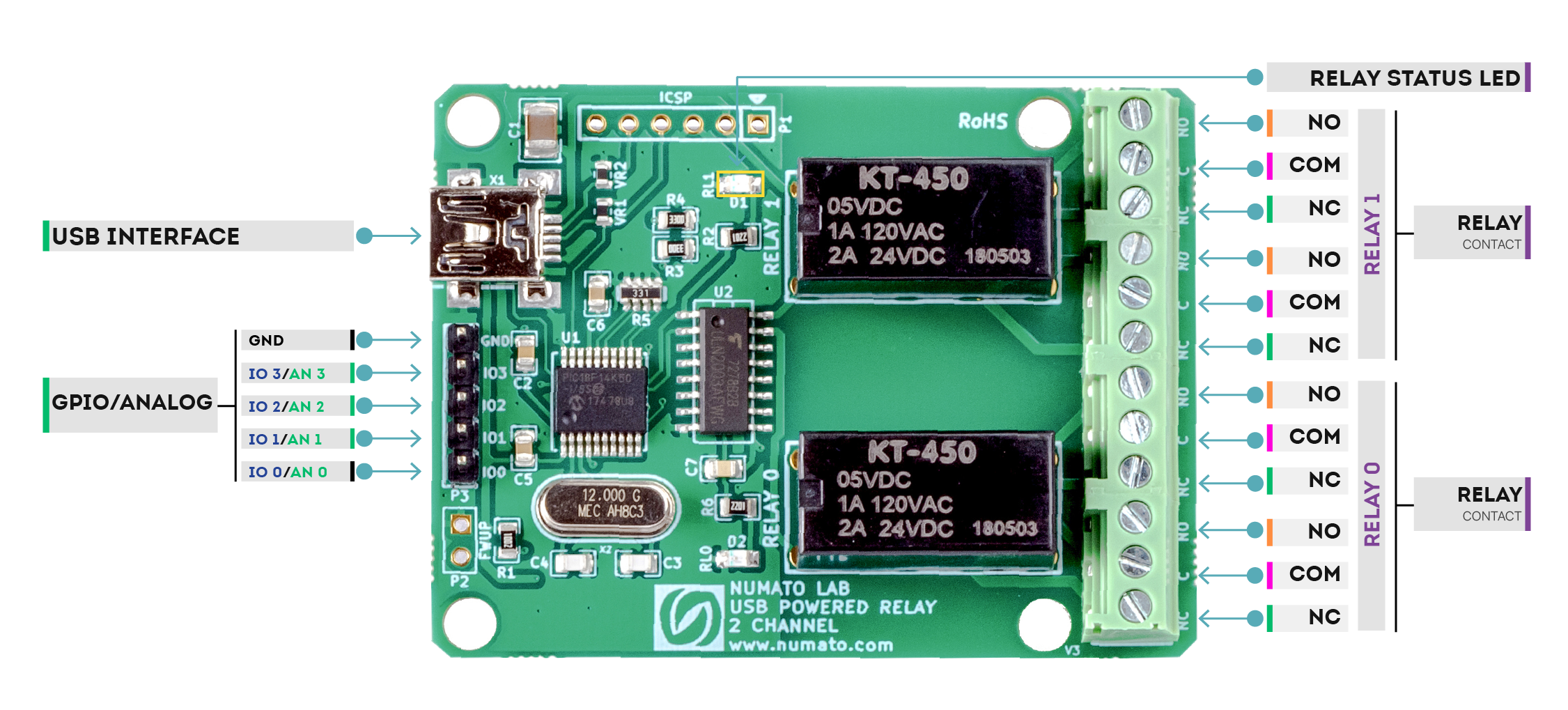 2 Channel USB Powered Relay Module is great for controlling your devices through USB without any USB protocol knowledge. This module plugs into your design seamlessly. Individual relays can be controlled by simple commands. The relays are powered from the USB bus so it is important to connect this board directly to a PC or to a powered hub. Numato's 2 Channel USB Powered Relay Module provides exceptional value for money. It has two onboard 5V DC relays that can switch up to 2A load. The relays and GPIOs can be controlled and read status by simple commands. The board, when attached to a PC/Laptop shows up as a serial port and all you need to control the board is a serial terminal application like HyperTerminal or Putty. This board can easily be controlled by writing simple serial port applications in VC++, VB, VBA (Word, Excel, etc), Perl, Python, etc.