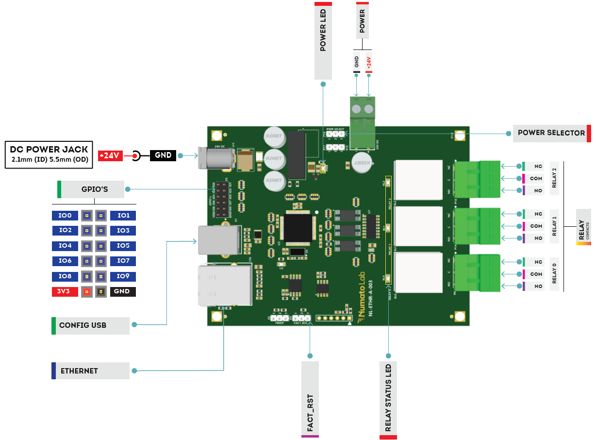 This product has 3 onboard SPDT Relays and 10 GPIOs. Each relay/GPIO can be individually controlled through the built-in easy-to-use web interface, HTTP commands or through any popular terminal emulator that supports TELNET protocol. Each 3 Channel Ethernet Relay Module is shipped with a unique MAC address. These devices also support assigning and retrieving custom identification strings that can be used for identifying individual devices when there is a large number of devices connected to the same network. All relay terminals are available on screw terminals which makes connecting external devices very easy.