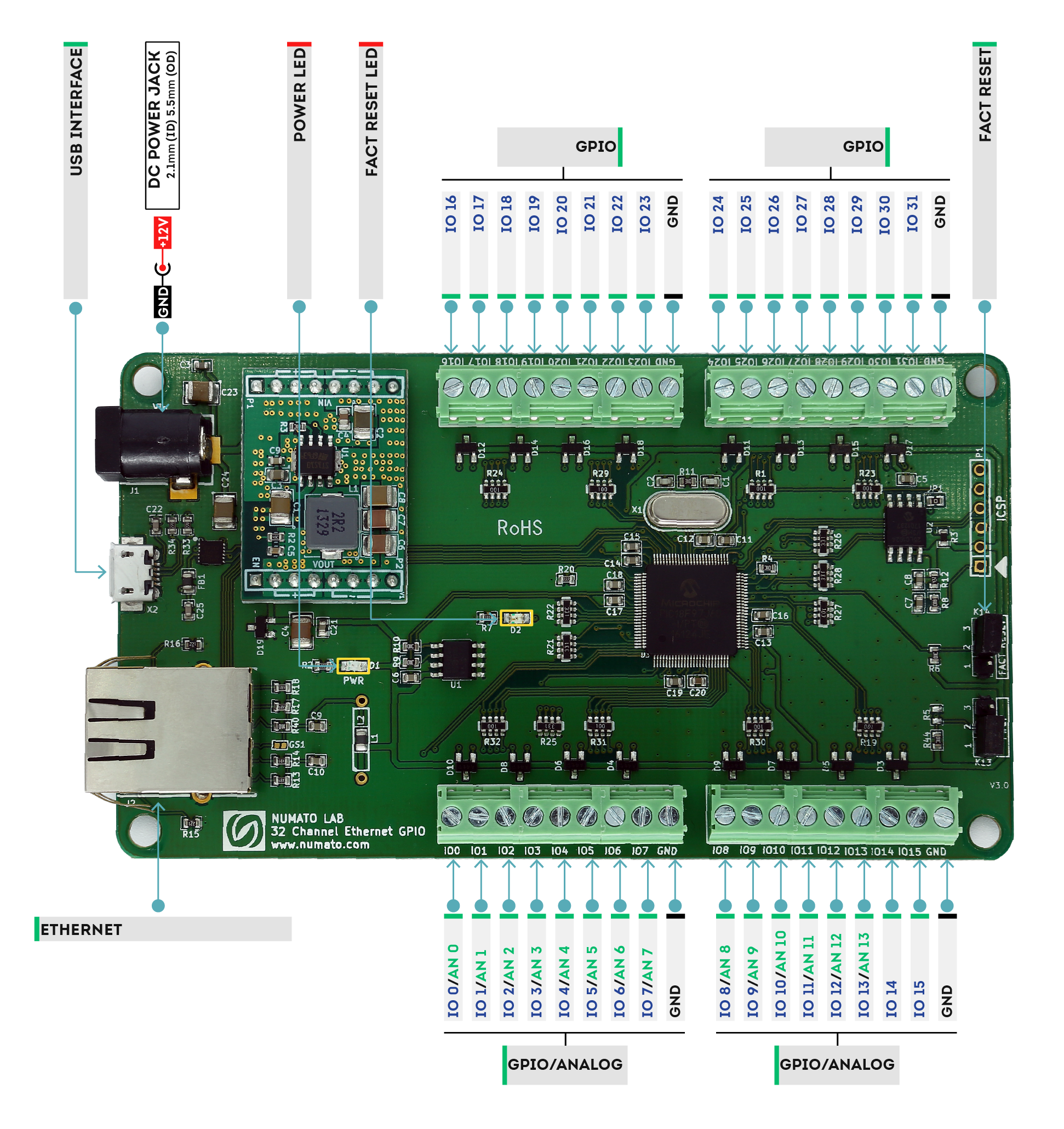 32 TTL (3.3V) compatible GPIOs available