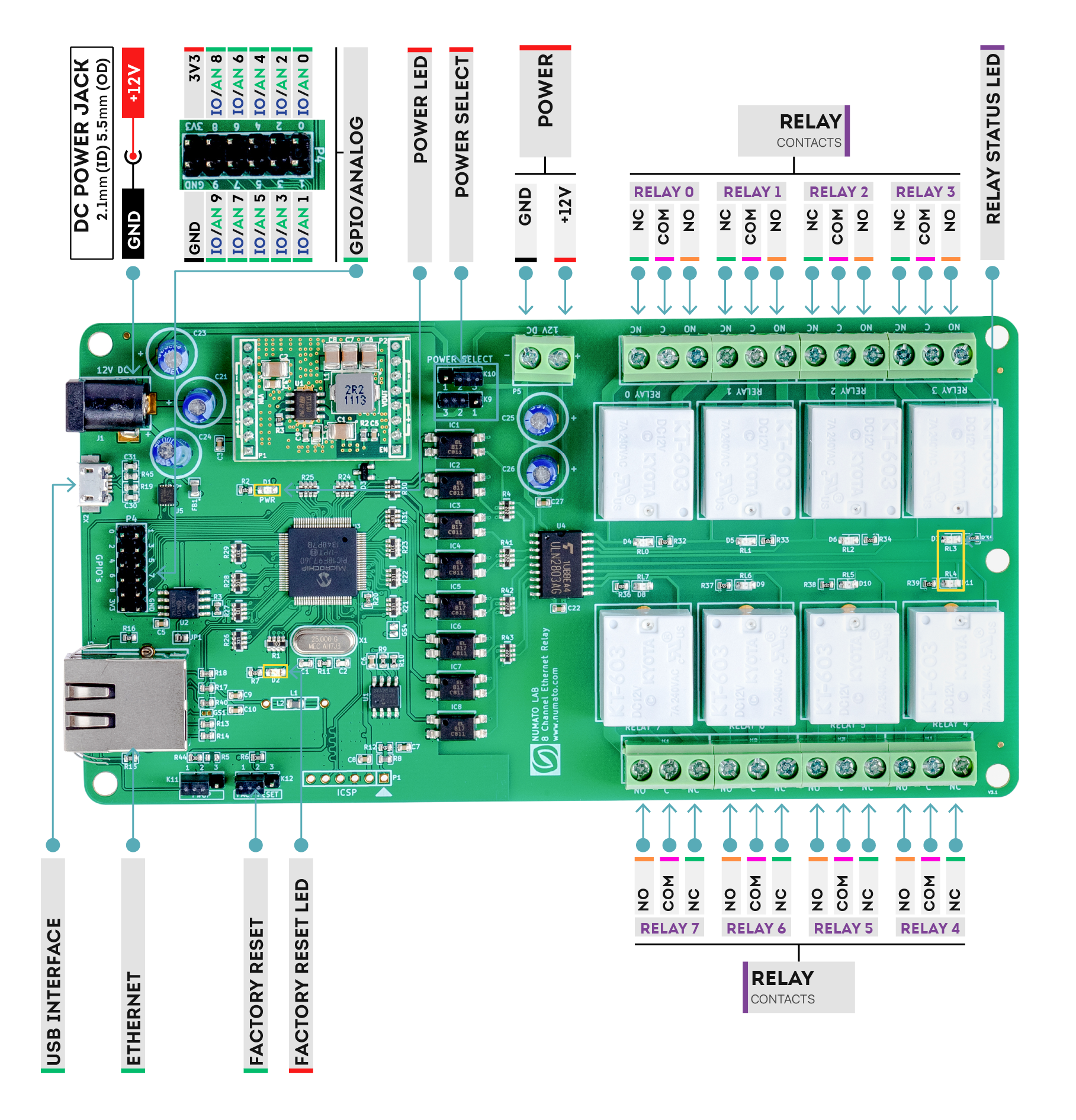 8 onboard 12V/ 24V SPDT relays that can handle up to 7A