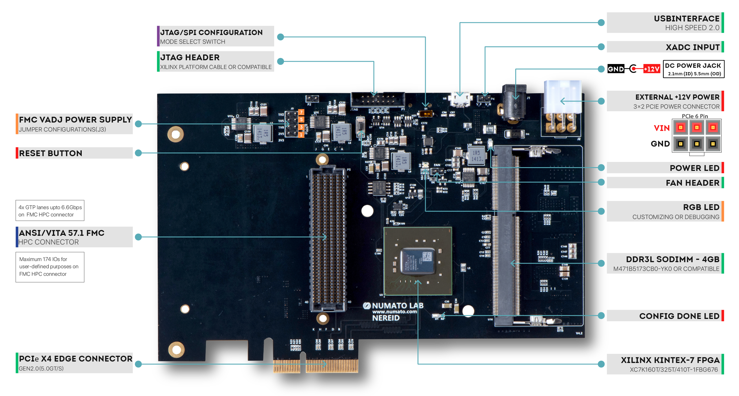 Nereid is an easy-to-use FPGA Development board featuring AMD Kintex-7 FPGA with x4 PCIe interface and 4GB DDR3 SDRAM. The board has AMD XC7K160T– FBG676 FPGA; other FPGA configurations are available at request. Nereid features a High Pin Count (HPC) high-speed FMC connector for the purpose of adding additional features to the board by using custom or commercial off-the-shelf daughter boards.