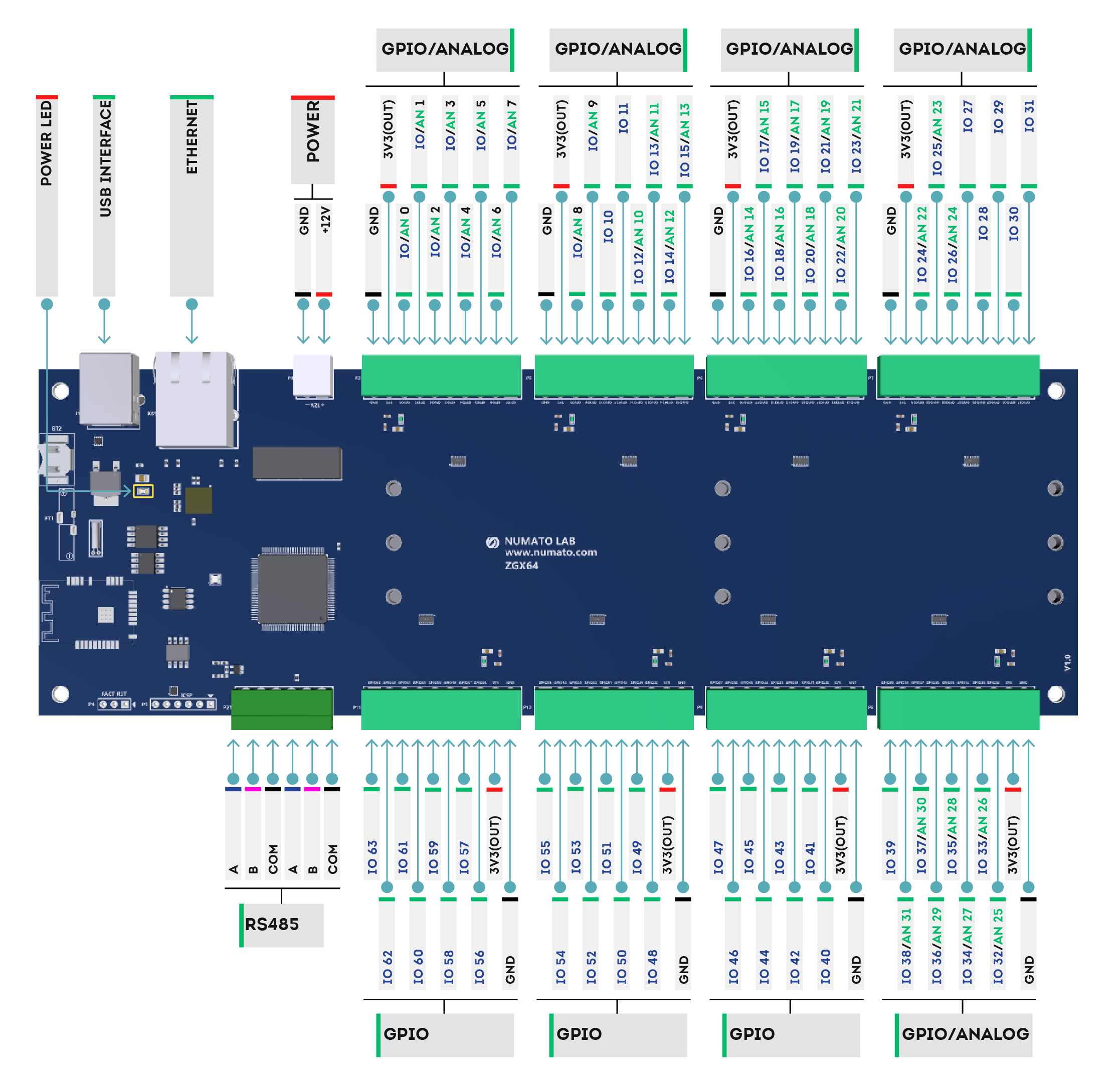 Prodigy ZGX16/ZGX32/ZGX64 is a Digital Input/Output module that supports Modbus RTU over USB and RS485 and Modbus TCP over Ethernet. This product has 16/32/64 GPIO(3.3V) multiplexed with 8/14/32(Max) Analog Inputs that support. The RS485/USB/Ethernet host interface makes connecting this device to any Windows, Linux, Mac machines, or embedded computers such as RPi an easy task. Meanwhile, support for industry-standard Modbus protocol makes it easy to use this device with almost any automation software that supports Modbus - RTU/TCP. ZGX16/ZGX32/ZGX64 when RTU model connected to a host computer, is enumerated as a regular serial port. This alleviates the difficulty of working with the USB protocol and offers a transparent interface to access the device. ZGX16/ZGX32/ZGX64 acts as a Modbus slave device at slave address 1. Flexible DIN Rail mounting system allows easy installation and removal with screws. ZGX16/ZGRX32/ZGX64 supports several features such as GPIO Timer, Safety Timer (Watchdog), Programmable Power-On State, etc.