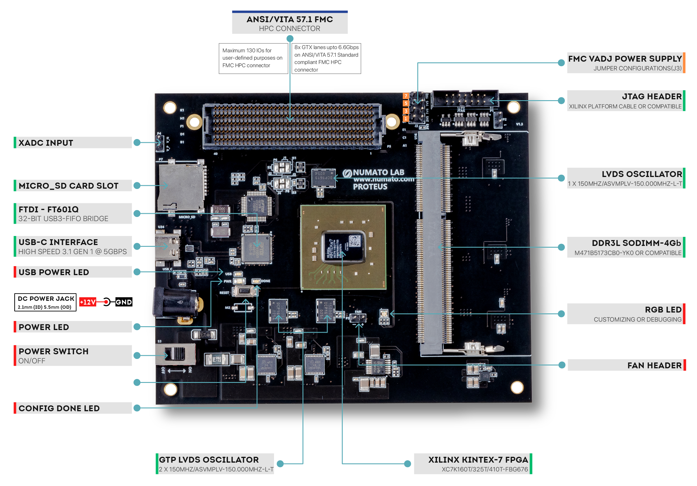 Proteus is an easy-to-use FPGA Development board featuring the AMD Kintex-7 FPGA with 4GB DDR3L SDRAM. This board contains the AMD XC7K160T– FBG676 FPGA (other FPGA configurations are available at request). The high-speed USB 3.1 interface (USB-C connector) provides a fast and easy configuration download to the onboard SPI flash. There is no need for a programmer or special downloader cable to download a Bitstream to the board. The board features a High Pin Count (HPC), high-speed FMC connector for aiding the addition of additional features to the board by utilizing custom or commercial off-the-shelf daughter boards. Proteus allows users to add their own peripherals through IO Expansion Headers.