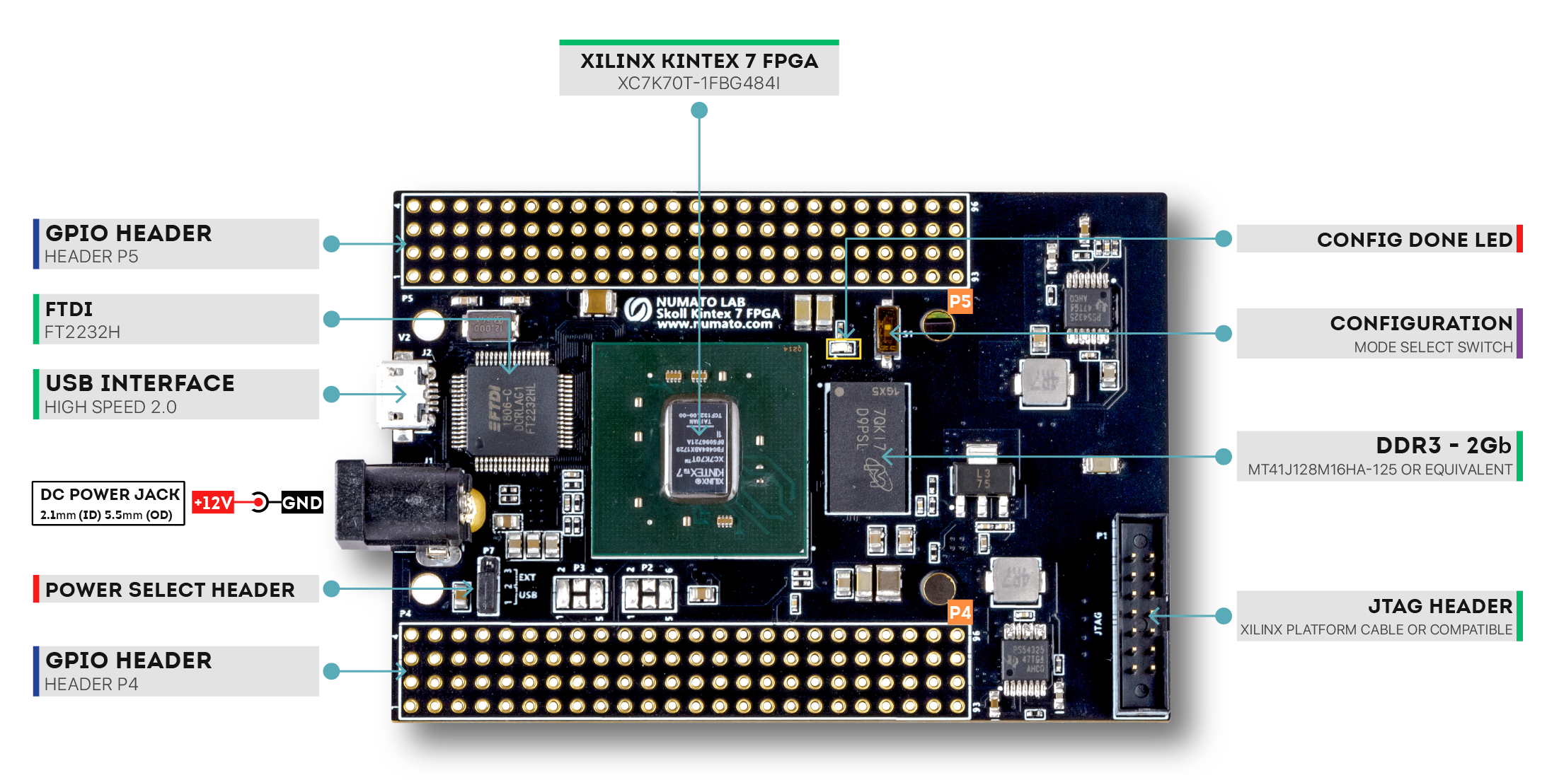 Skoll is an easy-to-use FPGA Development board featuring AMD Kintex 7 FPGA. It is specially designed for the development and integration of FPGA-based accelerated features into other designs. This development board features AMD XC7K70T FPGA with FTDI’s FT2232H Dual-Channel USB device. The high-speed USB 2.0 interface provides fast and easy configuration download to the onboard SPI flash. No programmer or special downloader cable is needed to download the bitstream to the board. The second FTDI channel can be used to develop custom high data-rate USB-based applications. Skoll provides user flexibility in adding their own peripherals through IO Expansion Headers.