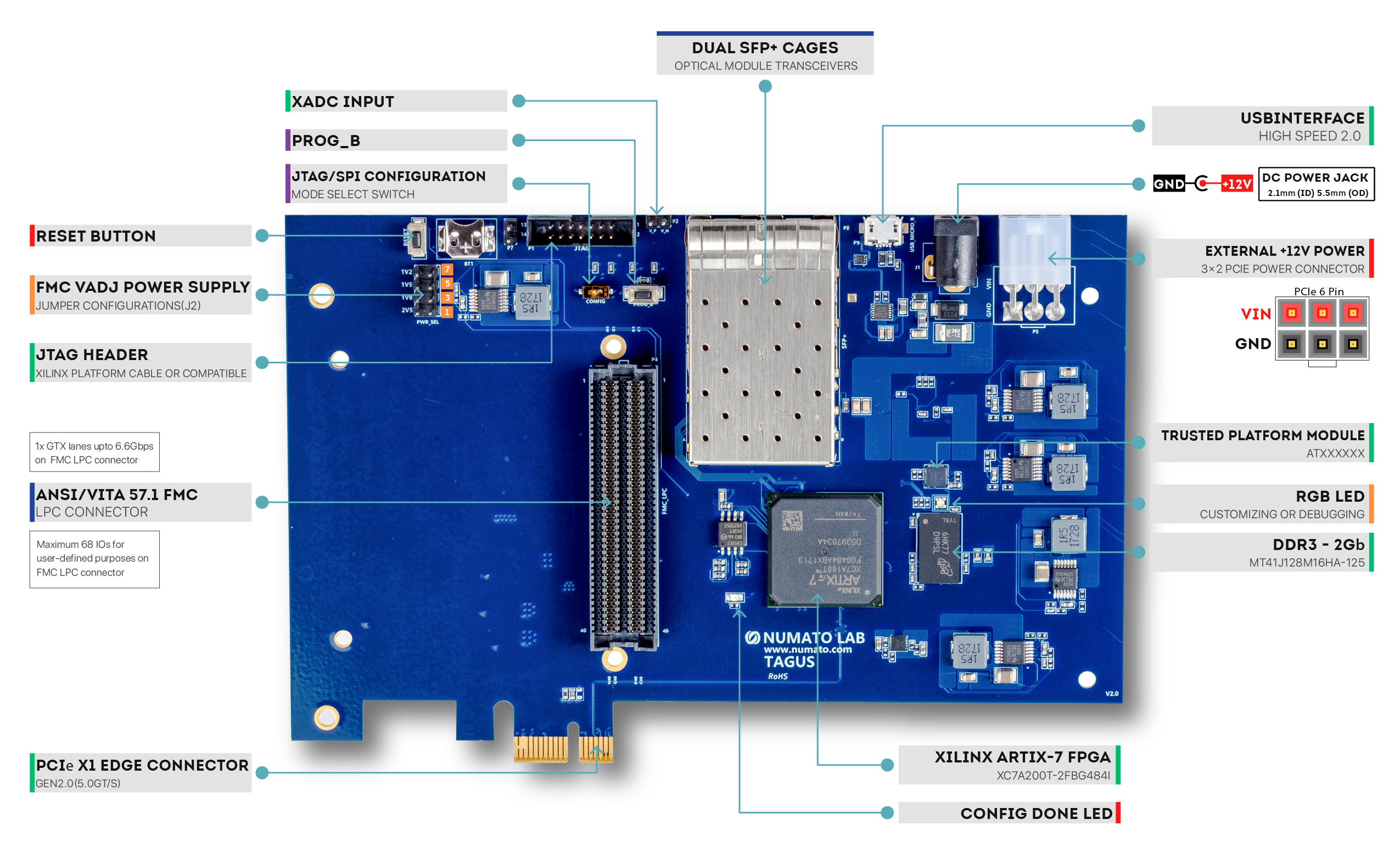 Tagus is an easy-to-use FPGA Development board featuring AMD Artix-7 FPGA with x1 PCIe interface, Trusted Platform Module (ATXXXXXX), Dual SFP cages, and 2Gb DDR3 SDRAM. This board features AMD XC7A200T– FBG484I FPGA. The board features Low Pin Count (LPC) high-speed FMC connector conforming to ANSI/VITA 57.1 Standard to add additional features to the board by using custom or commercial off-the-shelf daughter boards.
